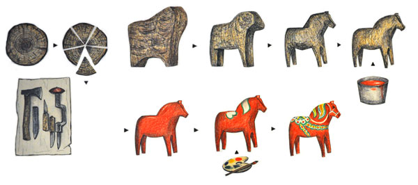 At first, the wooden horses were usually carved with very simple tools: an axe, a knife, sometimes a saw and drill. Sandpaper was not originally used. The woods were fir, pine, spruce and birch.